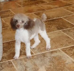 “Nugget” is a AKC Female Chocolate Merle Poodle