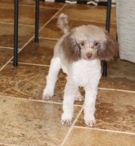 “Smores” is a Male Chocolate and White Parti Tiny Toy Poodle.