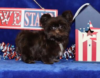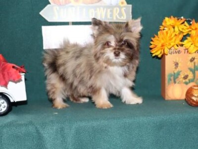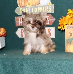 Our newest additions are Merle Teacup Yorkie puppies, featuring stunning color patterns such as Chocolate (Blackberry and Blueberry) Merle. Some of these puppies may have striking blue or green eyes, making them truly unique.