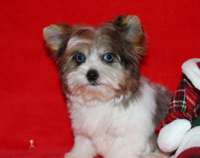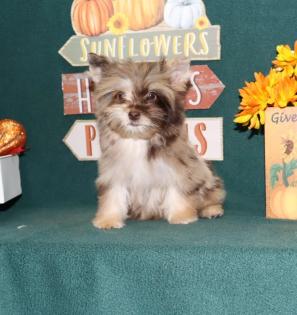 Our newest additions are Merle Teacup Yorkie puppies, featuring stunning color patterns such as Chocolate (Blackberry and Blueberry) Merle. Some of these puppies may have striking blue or green eyes, making them truly unique.